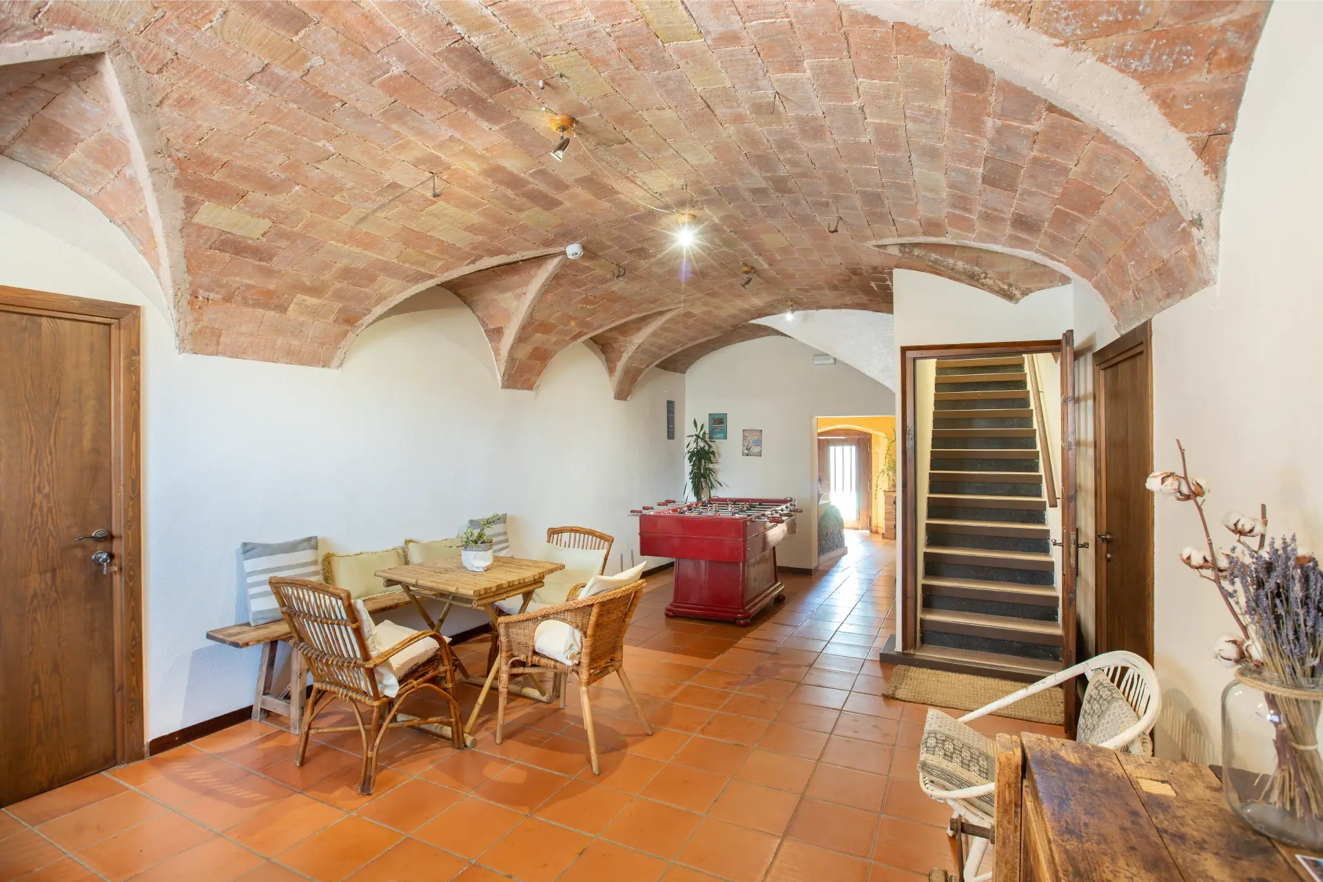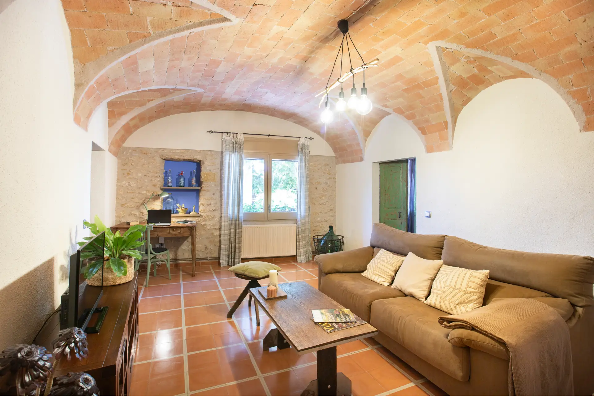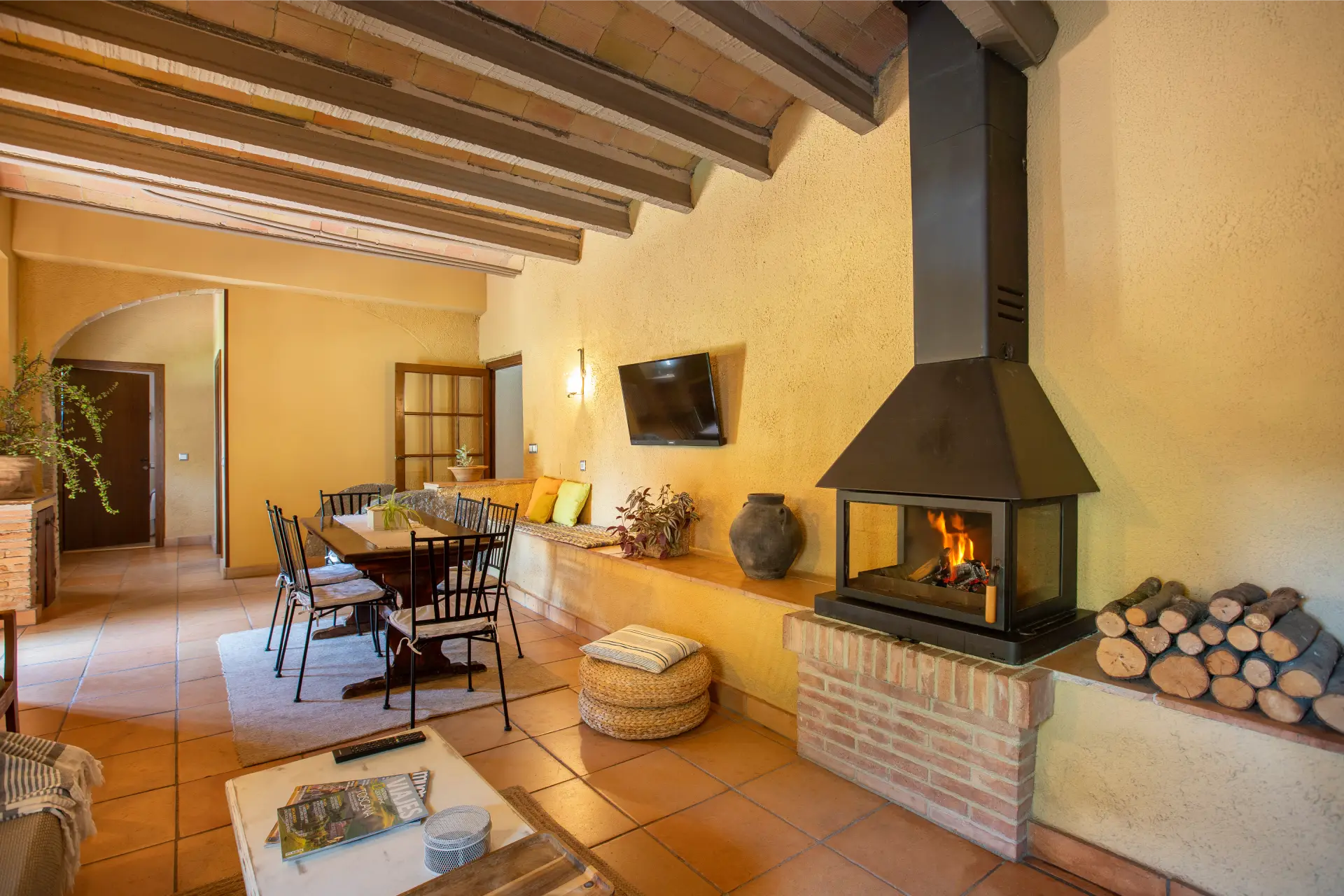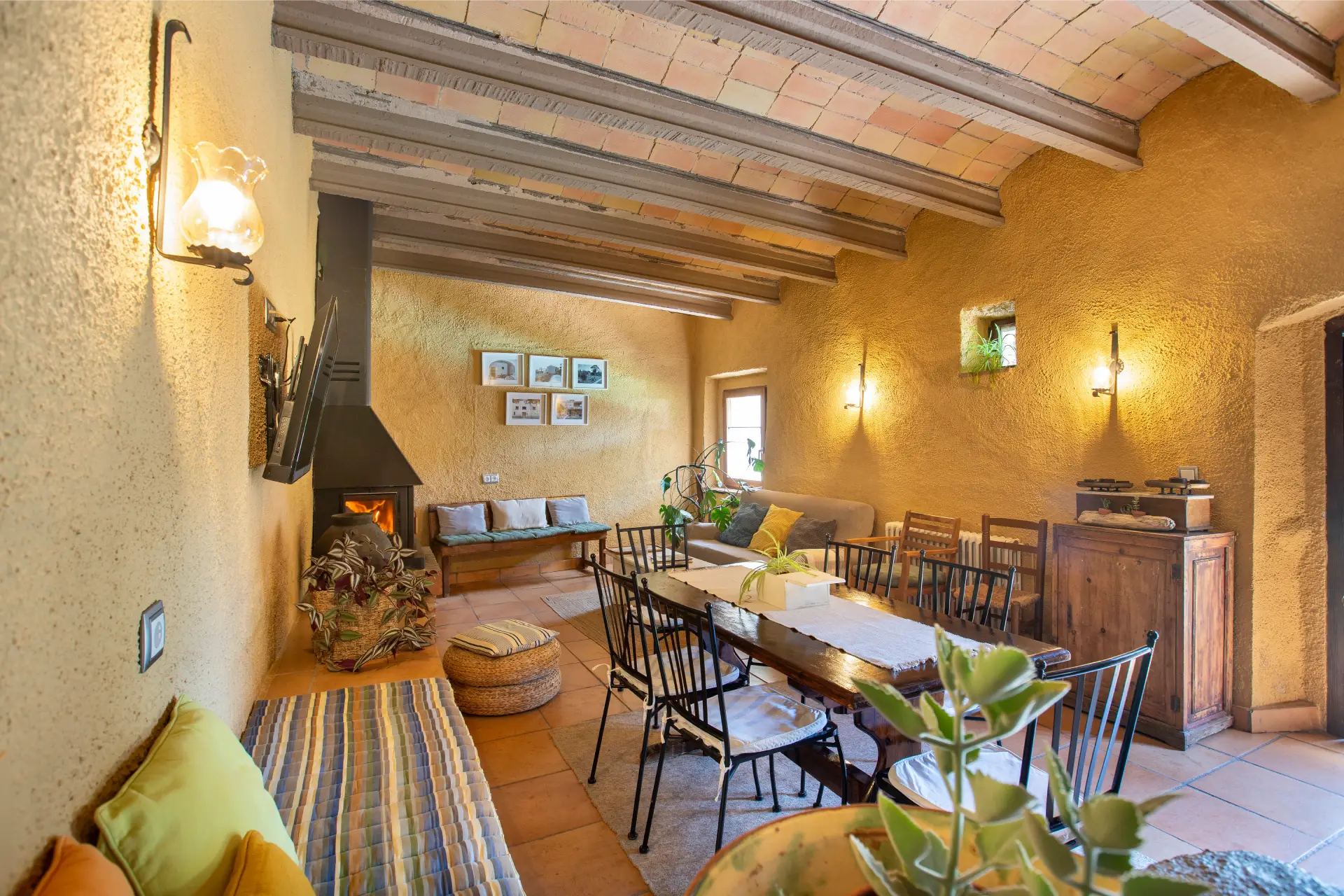 Els espais comuns de la casa estan pensats per oferir confort i moments compartits. Les dues sales d’estar permeten gaudir de la lectura, d’una conversa tranquil·la o d’una estona al costat de la llar de foc, creant una atmosfera íntima i acollidora. El menjador i la cuina, totalment equipada amb tots els estris necessaris, faciliten la preparació d’àpats en un ambient casolà i pràctic. La casa compta amb tres banys moderns i funcionals, dos dels quals sota la volta catalana, que aporta un toc d’encant i tradició. Aquests espais són ideals tant per relaxar-se com per compartir moments de convivència amb família i amics.