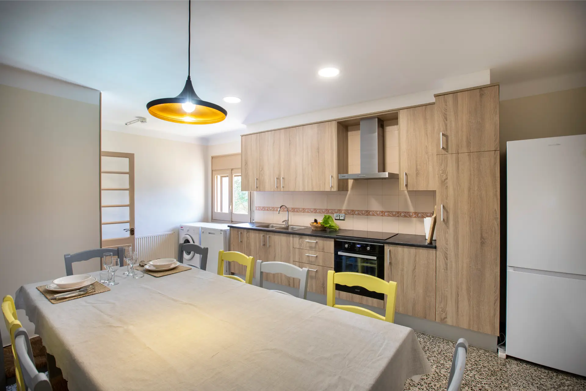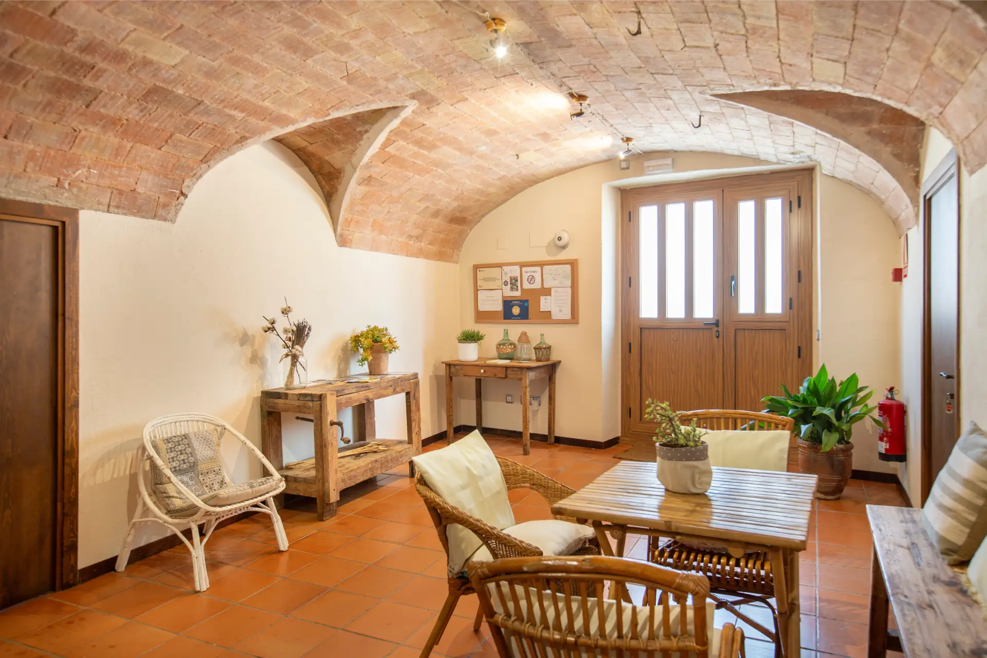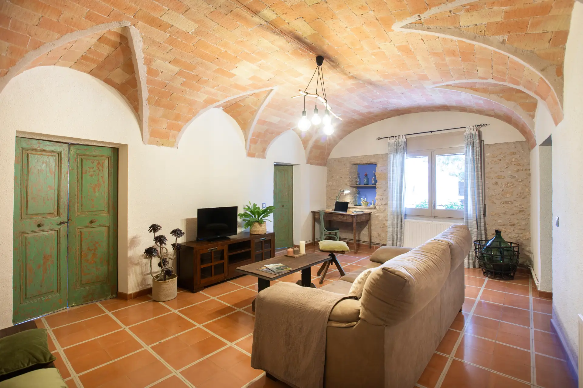 Els espais comuns de la casa estan pensats per oferir confort i moments compartits. Les dues sales d’estar permeten gaudir de la lectura, d’una conversa tranquil·la o d’una estona al costat de la llar de foc, creant una atmosfera íntima i acollidora. El menjador i la cuina, totalment equipada amb tots els estris necessaris, faciliten la preparació d’àpats en un ambient casolà i pràctic. La casa compta amb tres banys moderns i funcionals, dos dels quals sota la volta catalana, que aporta un toc d’encant i tradició. Aquests espais són ideals tant per relaxar-se com per compartir moments de convivència amb família i amics.