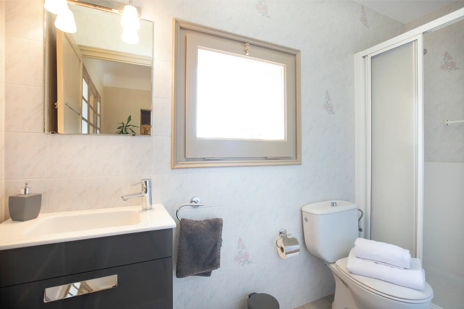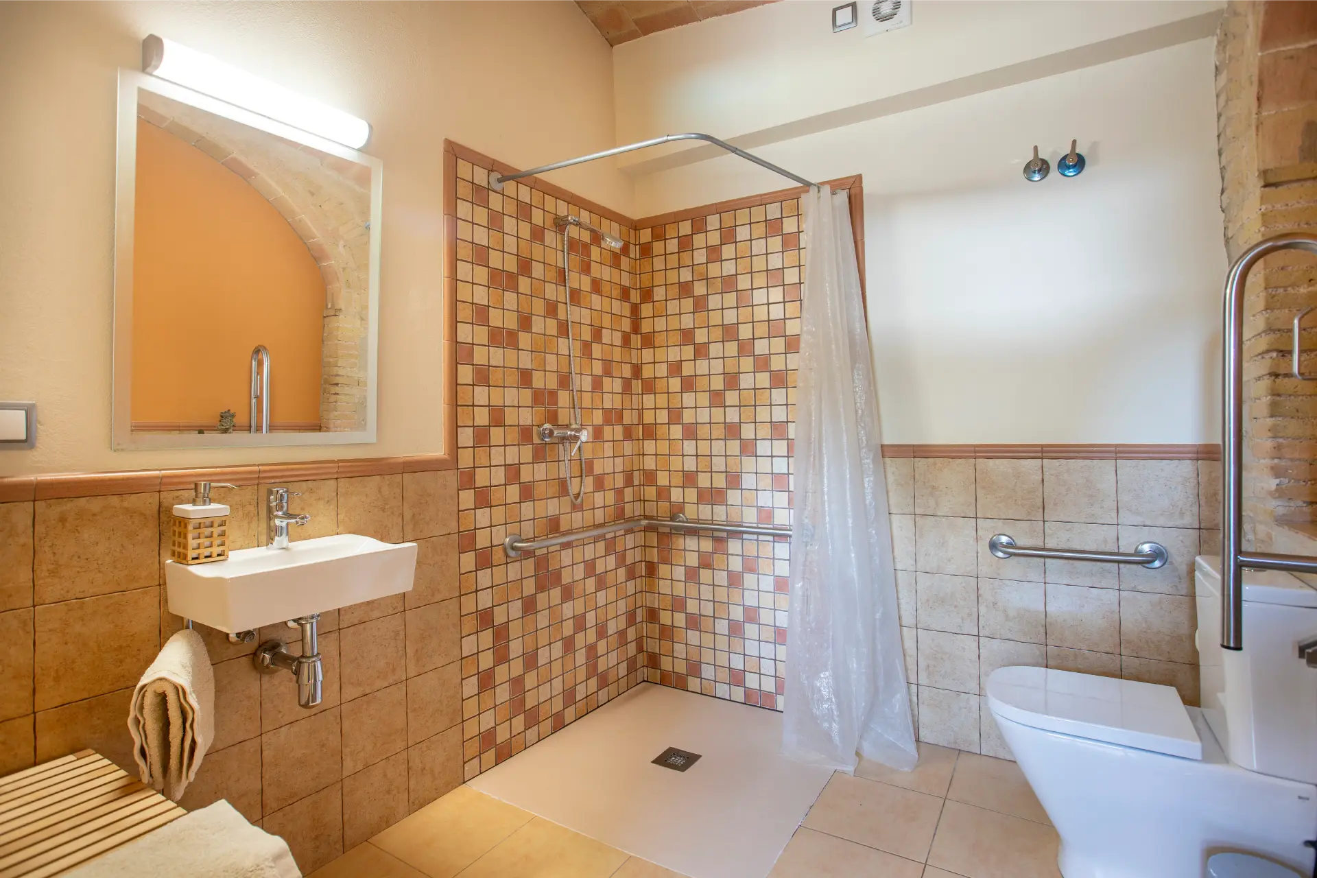 Tres banys moderns i funcionals, dos sota voltes catalanes i un adaptat per a persones amb mobilitat reduïda.