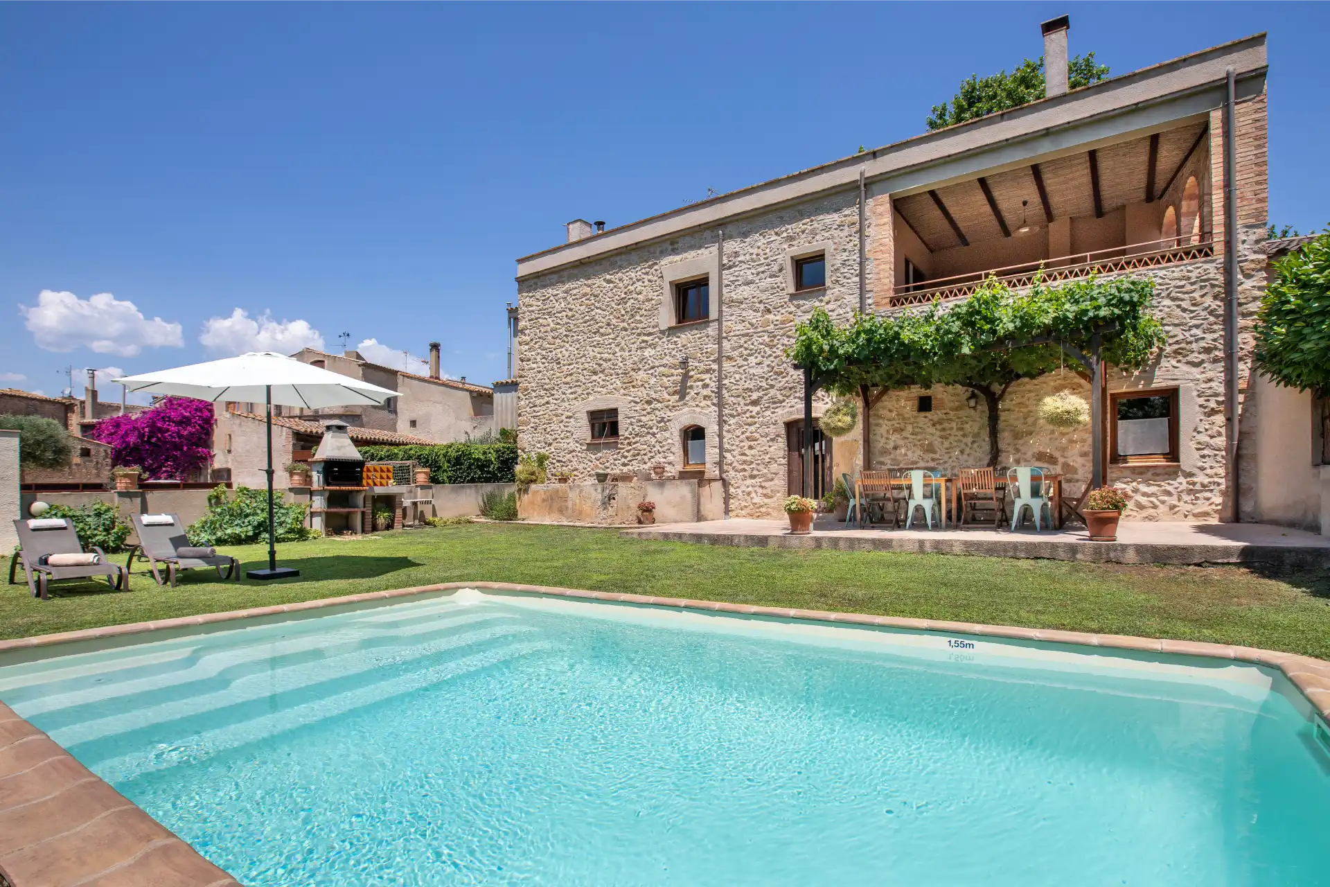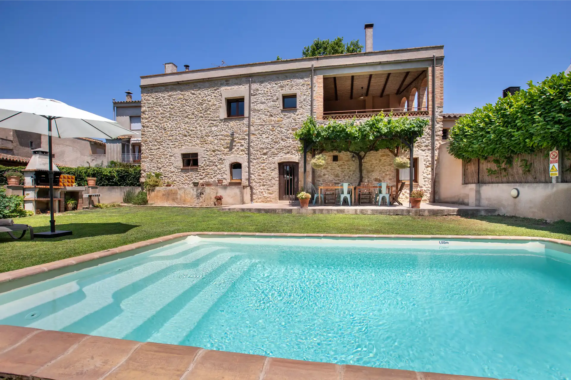 El jardí de Cal Ferrer Pujol és un espai tancat i ple d’encant, ideal per gaudir de l’aire lliure amb tota la família. Disposa d’una piscina per refrescar-se durant els dies calorosos d’estiu i d’una zona de barbacoa prop del porxo, perfecta per compartir àpats i moments de convivència. El porxo de fusta, cobert per una parra centenària, ofereix taula i cadires per prendre la fresca i gaudir de llargues vetllades. A prop de la cuina hi ha també una eixida amb bancs, un lloc tranquil on relaxar-se mentre es contempla el jardí i es respira la calma de l’entorn rural.