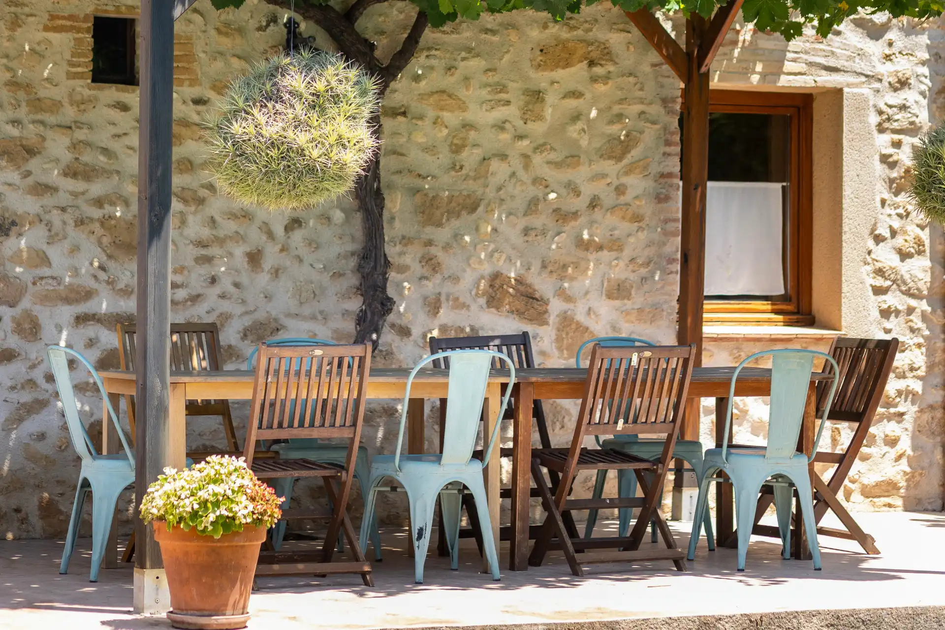 Menjador exterior amb porxo, parra centenària, taula, cadires i barbacoa per gaudir dels àpats a l’aire lliure.
