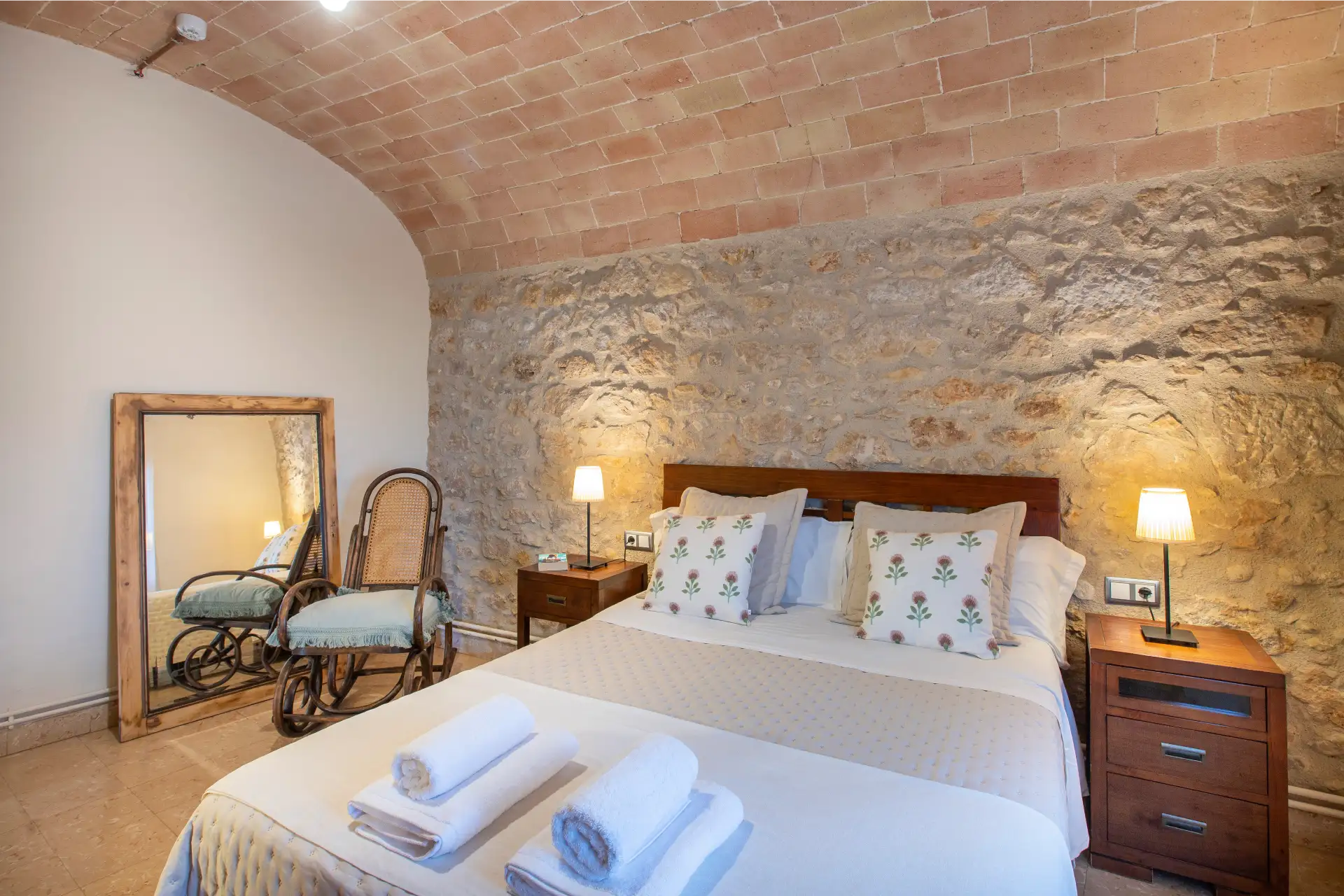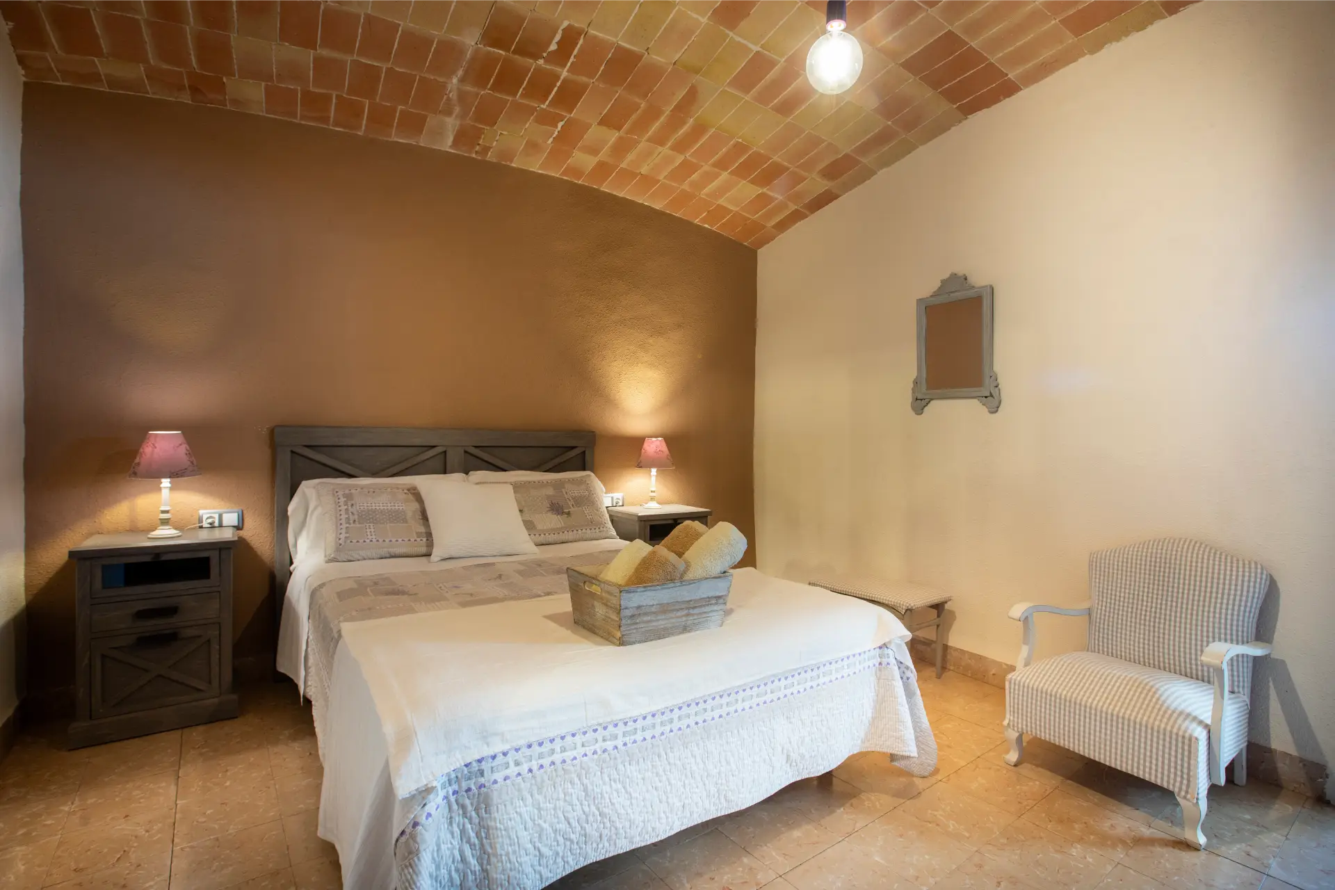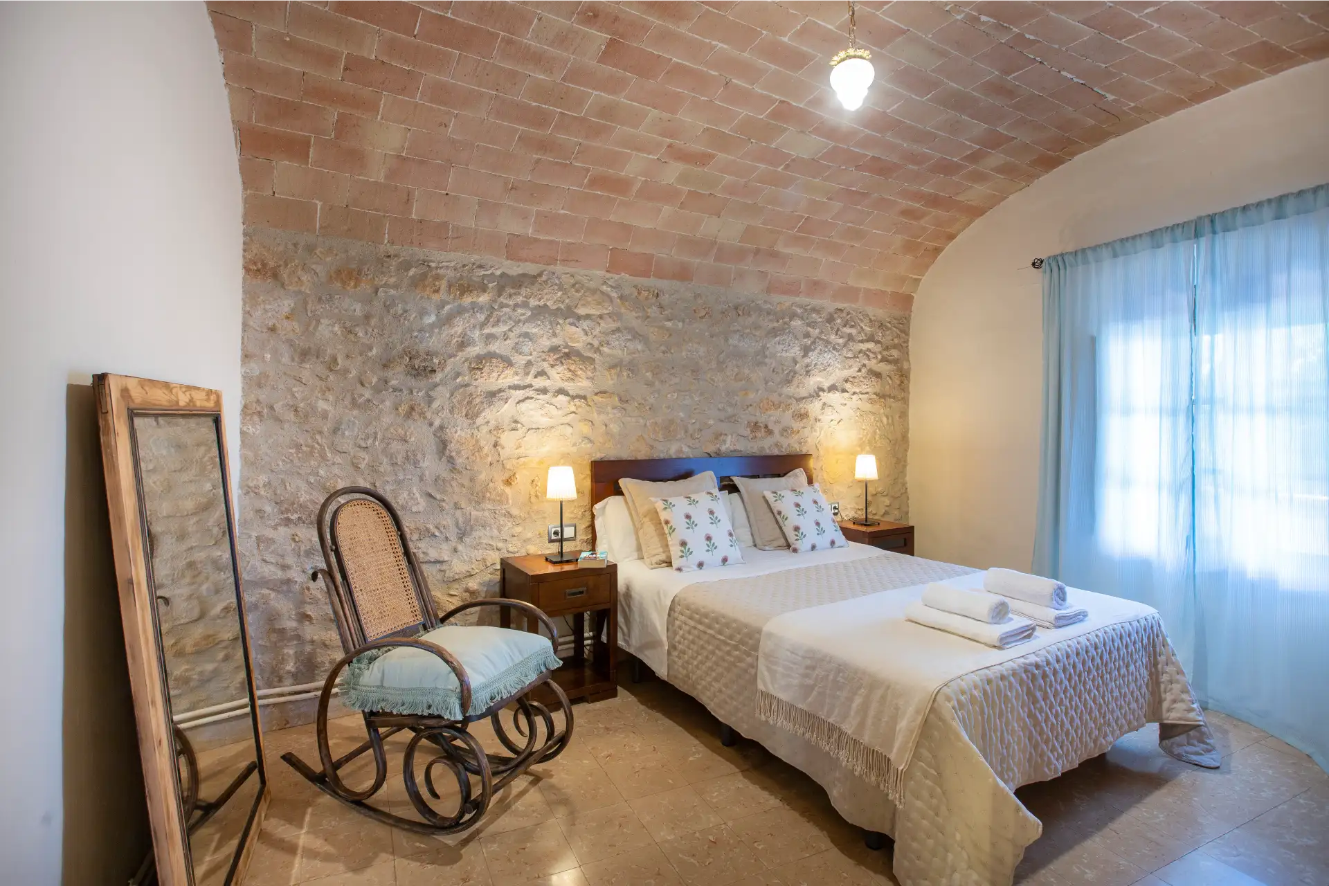 Cal Ferrer Pujol disposa de cinc habitacions que combinen comoditat i estil rústic, pensades perquè cada hoste trobi l’espai ideal per al seu descans. A la planta baixa hi ha una habitació doble adaptada per a persones amb mobilitat reduïda, amb accés directe al jardí i a la piscina. A la primera planta s’hi troben una habitació familiar amb annex, dues habitacions dobles amb llits individuals i una amb llit de matrimoni, totes elles amb un mobiliari acollidor i funcional. L’ambient càlid de les estances convida a relaxar-se després d’un dia de visites i activitats, creant una experiència de descans completa i autèntica.