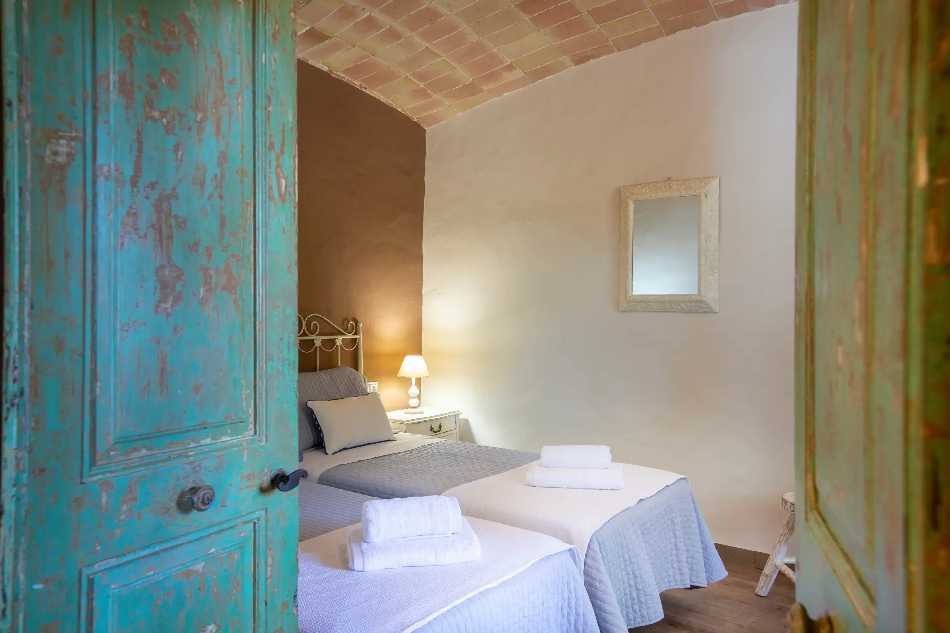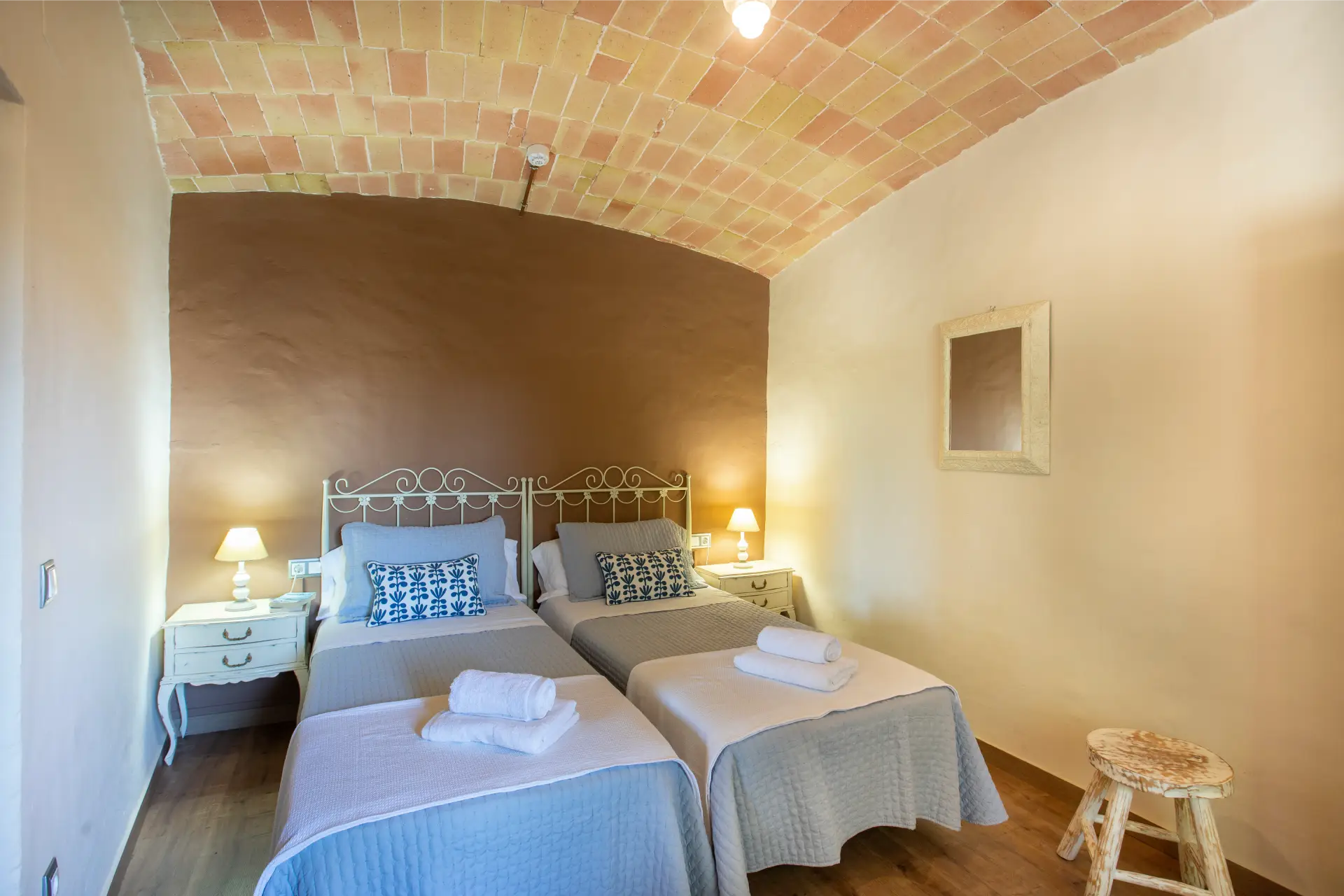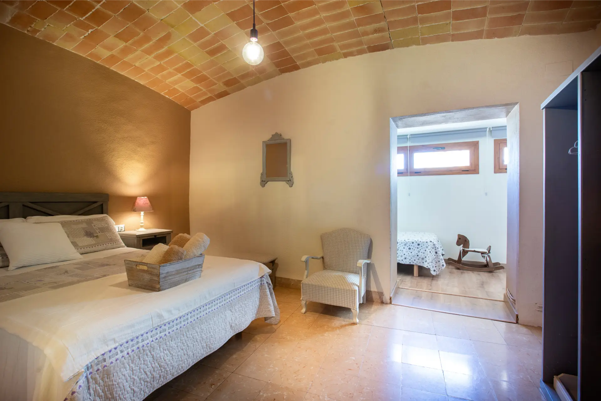 Cal Ferrer Pujol disposa de cinc habitacions que combinen comoditat i estil rústic, pensades perquè cada hoste trobi l’espai ideal per al seu descans. A la planta baixa hi ha una habitació doble adaptada per a persones amb mobilitat reduïda, amb accés directe al jardí i a la piscina. A la primera planta s’hi troben una habitació familiar amb annex, dues habitacions dobles amb llits individuals i una amb llit de matrimoni, totes elles amb un mobiliari acollidor i funcional. L’ambient càlid de les estances convida a relaxar-se després d’un dia de visites i activitats, creant una experiència de descans completa i autèntica.